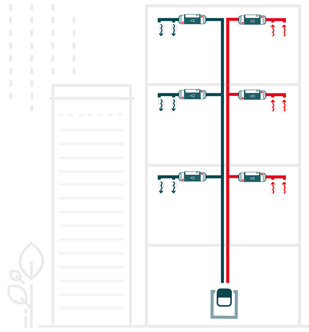 De ComfoAir Q kan buiten de appartementen geplaatst worden in een gezamelijke technische ruimte. Hierdoor is het niet nodig om voor onderhoud en het wisselen van filters de appartementen te betreden. Dit maakt het werk voor de installateur sneller, praktischer en minder storend.
